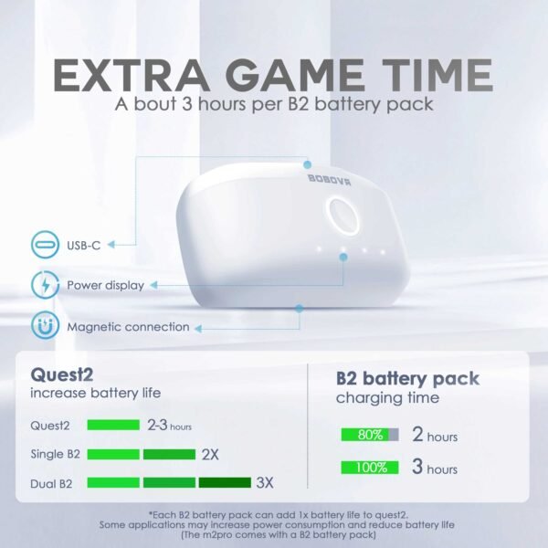 • Double the battery life: The battery capacity of a single battery pack is 5200mah, which can fully charge the Quest2 once, adding about 2-4 hours (APP depends) of VR time, and there is also a USB-C interface. Can power other accessories like BOBOVR F2.