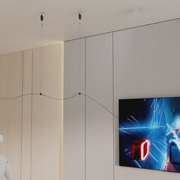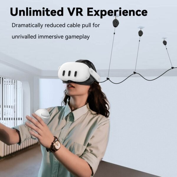 AMVR’s VR cable management system enhances immersion by reducing cable tension and noise, allowing you to move freely without tangling or tripping on VR headset cords.